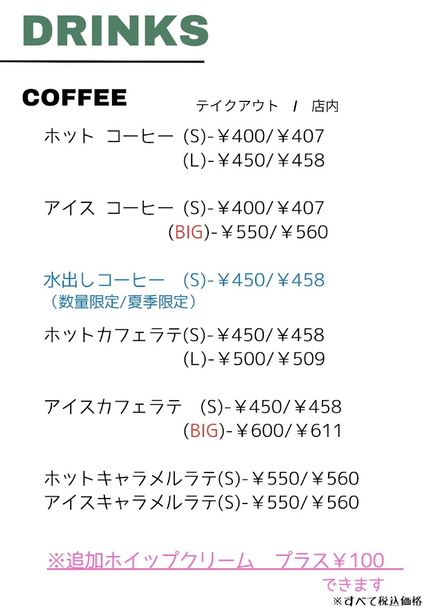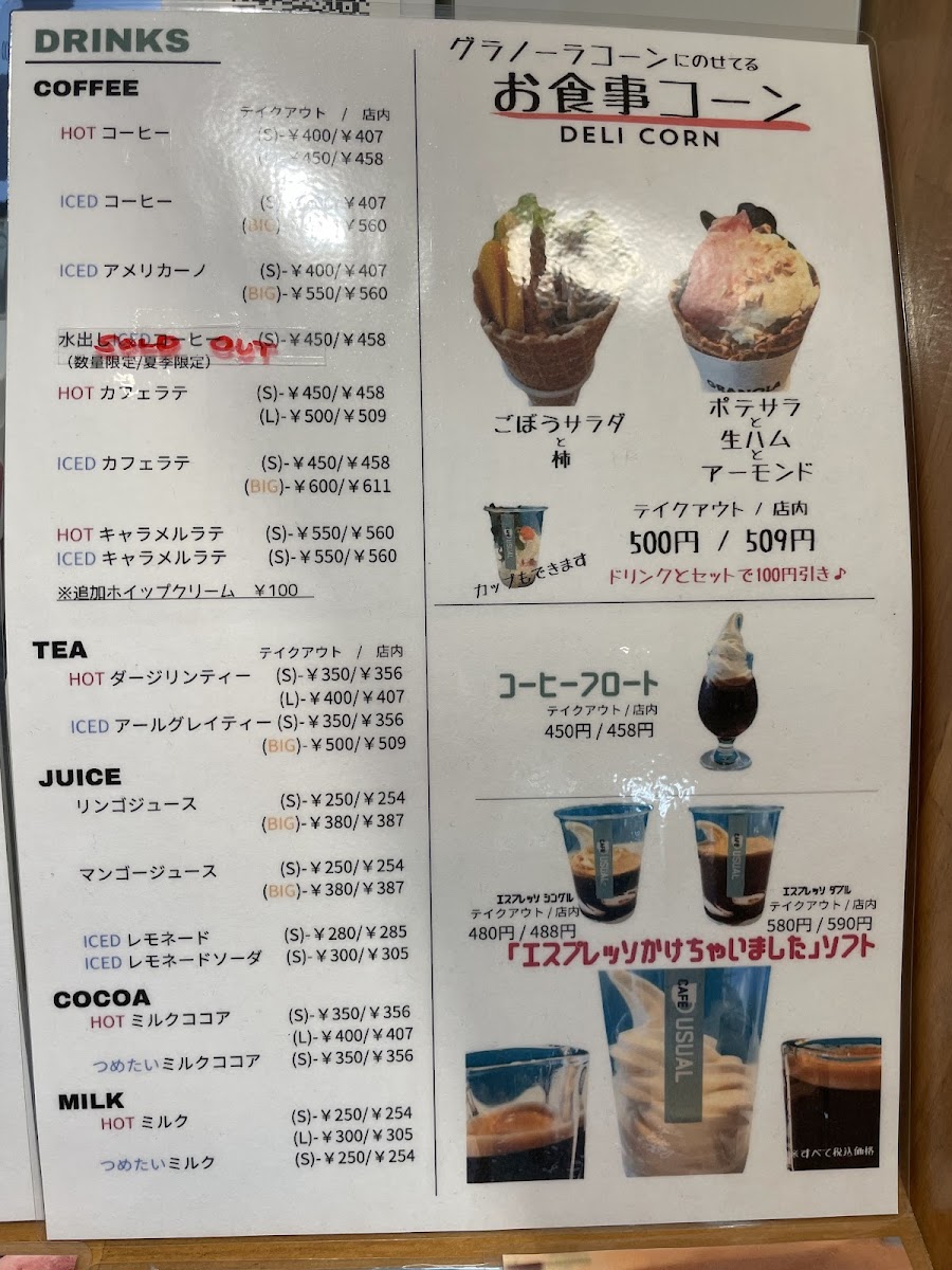 The menu at CAFE USUAL offers a variety of beverages and light food items suitable for casual dining, coffee breaks, or quick snacks. Visitors can expect a selection of coffee options, including iced and hot coffee varieties, as well as coffee floats. Soft serve ice cream and mini-sized desserts such as doughnuts are also available, providing light sweet choices.